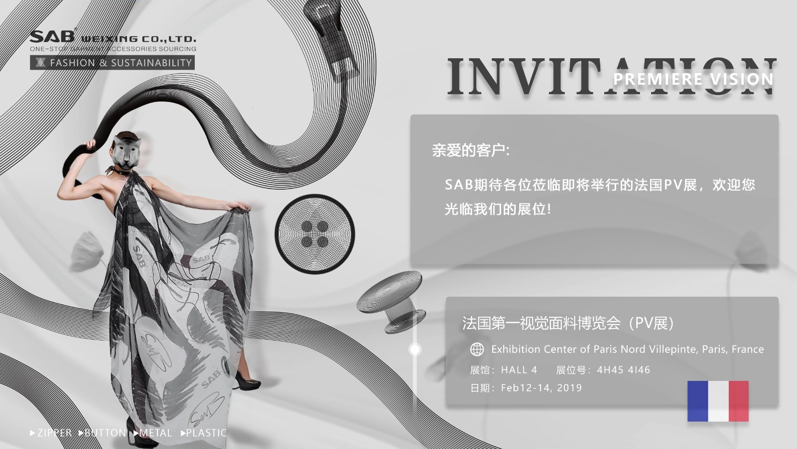 2019法国第一视觉面料博览会(PV展)地址:法国巴黎北维尔品特展览中心 Exhibition Center of Paris Nord Vil lepinte, Paris, France 时间:20190212-20190214 展位:4H45 4146